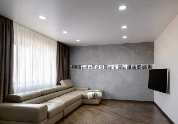 - Возможность встраивания светильников и монтажа светодиодной подсветки. За счет этого можно добиться очень интересных визуальных эффектов, выделить отдельные части помещения или зонировать пространство. Выбор осветительного оборудования настолько велик, что найти подходящее решение не составит труда.