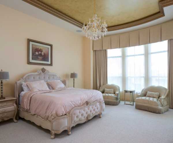На фото гипсокартонный вид фигурного потолка в интерьере спальни.