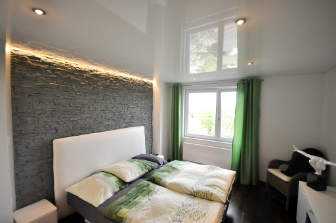 На фото глянцевое натяжное полотно в современной спальне.