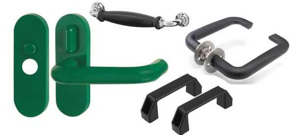 - Пластиковые ручки для межкомнатных, а тем более входных дверей используются крайне редко. Прочность у таких ручек низкая, да и внешний вид оставляет желать лучшего. Полимеры преобладают в мебельном направлении;