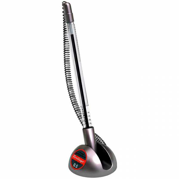 Это изделие отличается тем, что оно продается вместе с небольшой подставкой. Она крепится на любой ровной поверхности. Делается это при помощи клейкого основания. Ручка получилась достаточно толстой. Однако держать её в руке комфортно, претензий к этому нет никаких. При необходимости здесь легко можно поменять стержень. Установленный по умолчанию стержень имеет пишущий узел диаметром 0,5 мм.