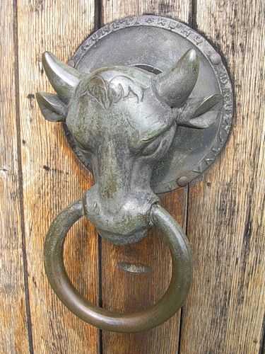 ![]() | Ручка гонг Используется такая дверная ручка для входной двери и зачастую монтируется по центру, на уровне глаз. Гонг предназначен не столько для открывания дверей, сколько в качестве сигнального устройства. По сути это импровизированный молоточек, вы беретесь за кольцо и стучите им по металлической пластине, закрепленной на дверях или прямо по дверям.