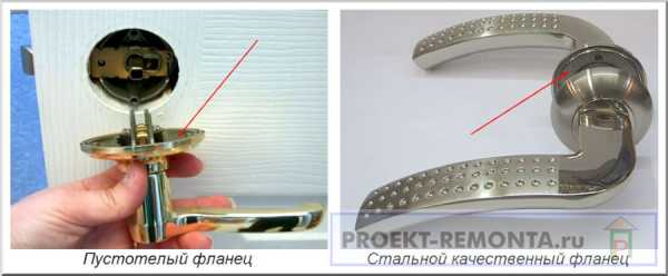 В дешевых моделях фланец пустотелый, плюс штампуют его из металла толщиной до полмиллиметра. Для дверей спальни или кладовой такую ручку брать можно, а вот на входную дверь ее устанавливать не стоит. Массивный, но подозрительно легкий фланец, скорее всего, сделан из силумина и сломается он за полгода.