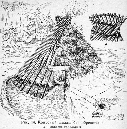 Сооружение шалаша состоит из сборки остова и тщательного его укрытия обкладочным материалом, обустройства кострища.