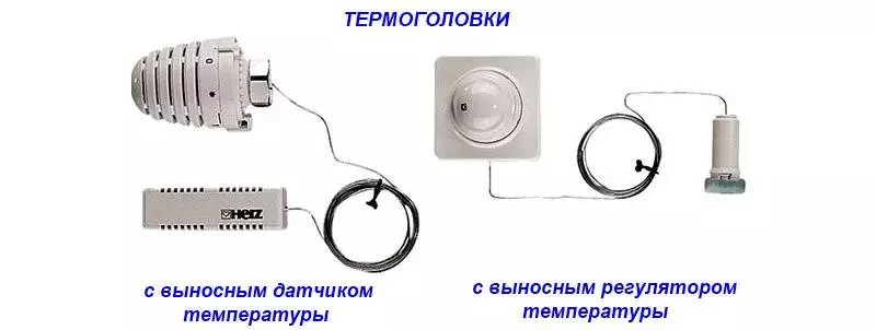 термоголовки с выносным термодатчиком. Такие термоголовки используются, когда нет возможности горизонтально установить терморегулятор или к нему нет свободного доступа воздуха. Необходимость использовать такие термоголовки часто возникает, когда радиаторы расположены за плотными шторами, широкими и низко расположенными подоконниками или рядом с ними находятся другие источники тепла.