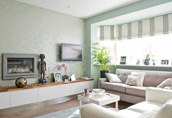На фото дизайн гостиной в пастельных тонах с настенными нежно-зелеными обоями с золотым рисунком.