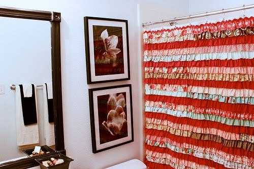 Так же в ванной можно сделать красивые шторы, что сделает ванную комнату более уютной. Декоративную штору можно сшить самим из любой понравившейся ткани, ничего с ней не случится если вы сделаете 2 штанги, на одной будет обычная штора, а за ней уже декоративная.
