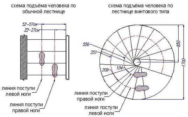 Важно понимать, что удобство и безопасность перемещения по винтовой лестнице обеспечивается правильной конструкцией и оптимальными размерами ступенек. При этом за основу берутся эргономические показатели, такие как длина шага человека и длина стопы. Так, оптимальным считается длина шага в пределах 59-65 см. А длина стопы взрослого человека приблизительно равна 30 см.