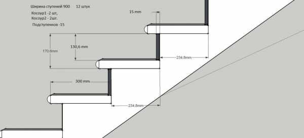 Расчет длины косоура производится согласно с теоремой Пифагора. Для его произведения необходимо две длины лестницы умножить на две высоты лестницы и получится длина двух косоуров.