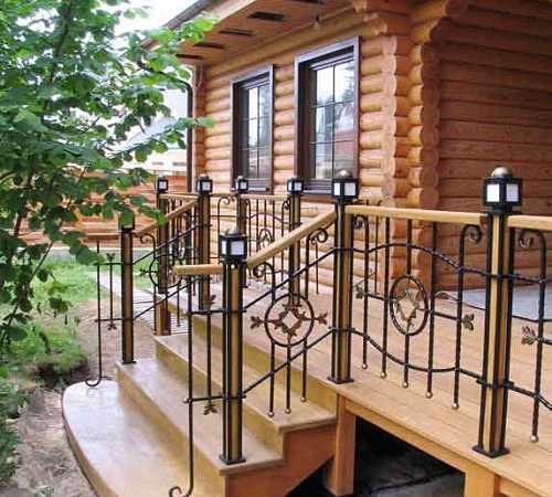 Украсят интерьер дачного дома, как кованые ажурные коллекции, так и простые завитки из металлических прутьев. Они надежно крепятся саморезами и шпильками. Перила могут быть, как алюминиевые, так и пластиковые.