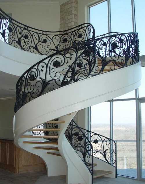 Более легкие кованые винтовые лестницы в стиле модерн украшены изысканными ограждениями в виде виноградной лозы и других растительных мотивов. Также лестницы с коваными деталями гармонично вписываются в средиземноморский, колониальный и готический стиль.