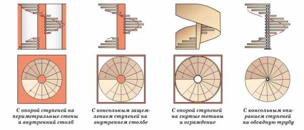 Всего известно четыре типа винтовых лестниц. Каждый из них имеет свои особенности и тонкости установки.