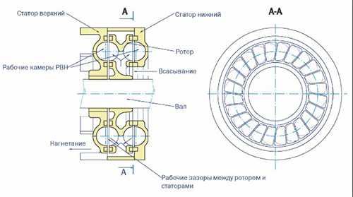 Вихревые скважинные насосы, как правило, одно- или двухступенчатые. Конструкция вихревого скважинного насоса представлена на рисунке.