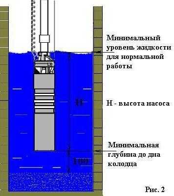 - Минимальный уровень жидкости для непрерывной работы насоса должен находится выше, чем глубина погружения насоса (рис. 2).