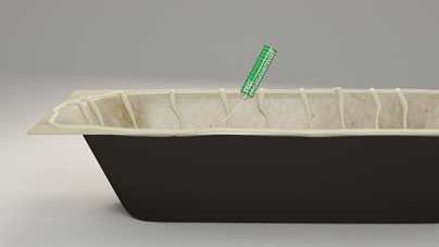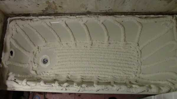 - Поверхность емкость для мытья равномерно покрывают специальной пеной. Важно распределить пену максимально ровным слоем, чтобы исключить образование пустот. Толщина слоя зависит от точности подбора и подгонки акрилового вкладыша.