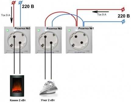 Для подключения электрокамина мощностью в 2кВт стоит предусмотреть отдельную независимую розетку, утюг же смело можно запитывать от точек, соединенных шлейфовым способом
