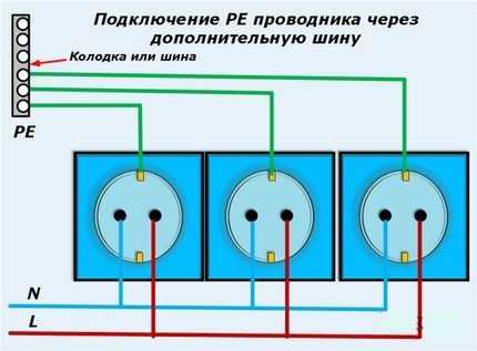 Главная задача при подключении розеток, оборудованных заземлением – обеспечить элементов на протяжении всей линии. Ведь если контакт заземления по какой-либо причине перегорит в головной питающей розетке, все остальные участники цепи утратят защитный ноль. А потому при необходимости ответвления заземляющей жилы применяют самый надежный тип соединений – опрессовку.