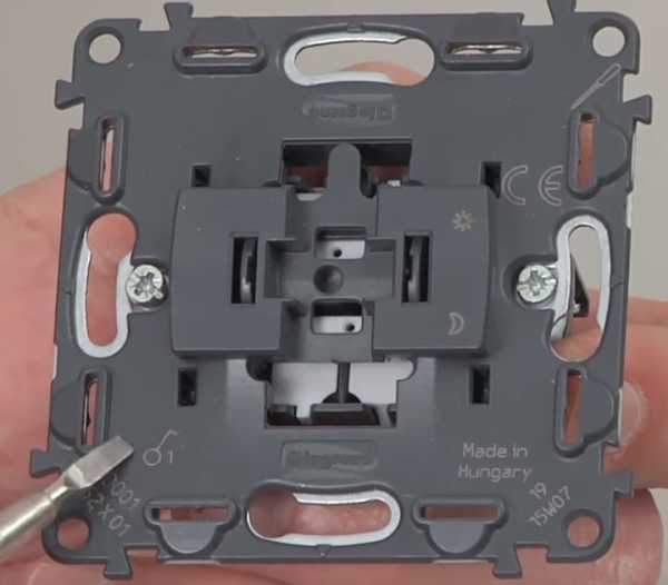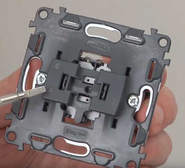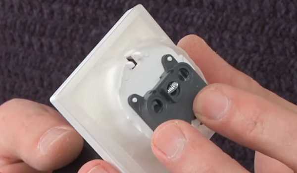 Теперь перед нами лицевая панель выключателя, за которой скрывается рабочий механизм. Ее тоже необходимо снять. В разных моделях она может крепиться по-разному. Чаще всего встречается разновидность с фиксаторами, которые легко отжимаются плоской отверткой. После этого панель легко удаляется. В некоторых случаях придется открутить крепежные винты. Остается достать рабочий механизм из корпуса выключателя.