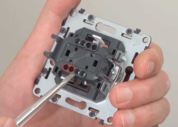 К первому подключается фаза, идущая на светильник, ко второму – фаза, которая приходит на выключатель. Производитель обычно маркирует контакты рабочего механизма, обозначая подходящий и отходящий контакты.
