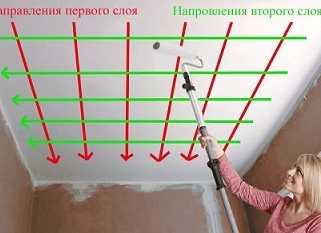 следует избегать соприкосновения валика с потолком. Для большей надежности рекомендуется окрасить валиком одну верхнюю полосу в горизонтальном направлении.