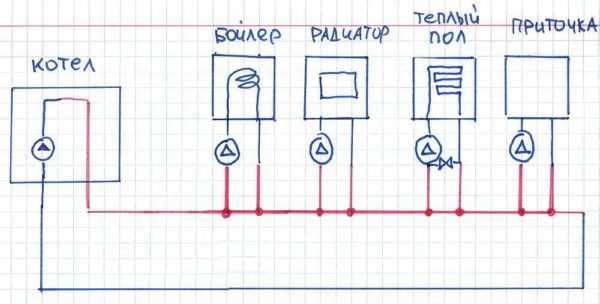 Так же, как и в предыдущей схеме, в двухнасосной предполагается кратковременное отключение отопительной линии при работе контура ГВС, но, как правило, за короткий промежуток не происходит значительное снижение температуры в помещении. Впрочем, избежать такой ситуации можно, подключив два котла вместо одного, при этом функция второго будет сосредоточена на переключении режимов.