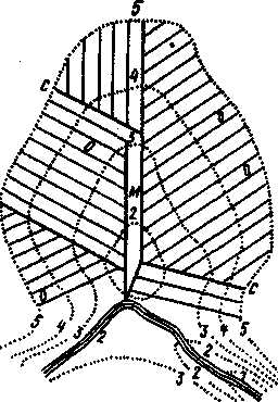 Схема открытой осушительной сети на территории крупного парка: С- собиратели; О- осушители; М-магистральный.