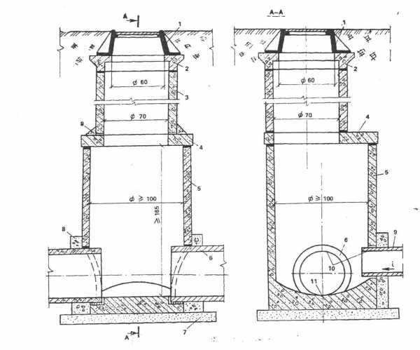 Для труб и коллекторов диаметром более 120 см рабочие камеры делают обычно прямоугольными, по индивидуальным проектам. Диаметр горловины принимают равным 70 см, а высота горловины зависит от глубины заложения трубопровода.