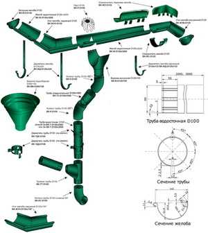 Для сборки водостока приняты стандартные элементы, которые служат для определенных целей: