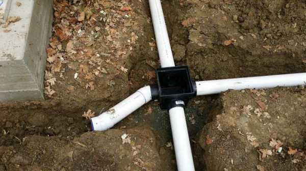 В месте пересечения труб надо расширить котлован, углубив его примерно на 1 м. Уложим их в траншеи, предварительно вставив прямоугольные колена, разместим которые прямо под водосточкой.
