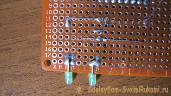 Светодиоды можно использовать сигнальные любого цвета, какой Вам понравится, диаметром 4 – 5 миллиметров. Цоколёвка светодиодов и микросхемы есть на схеме.