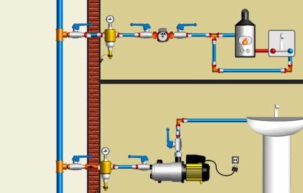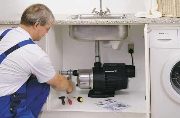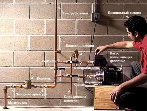 Врезка насоса в домашней водопроводной системеПовысительную водонапорную технику также устанавливают в тех случаях, когда давление в различных точках потребления в пределах одной квартиры различается, или полностью отсутствуют комфортные условия для проживания (вода течёт тонкой струйкой постоянно, нет возможности включить стиральную машину, отопление, прочее).