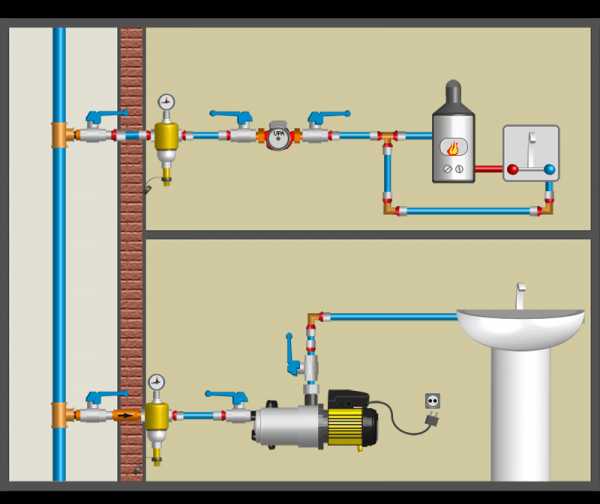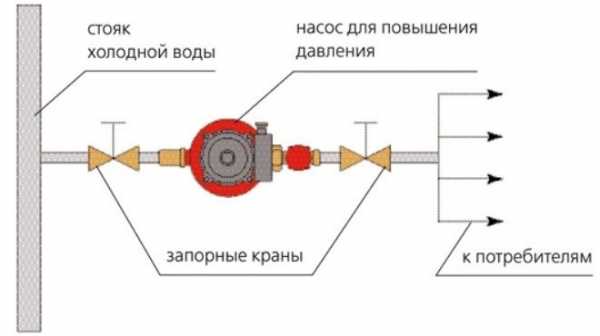 При необходимости увеличения напора, используют компактный насос для воды с врезкой в трубопровод. В случае необходимости поднятия воды с нижних этажей к верхним, требуется установка центробежного аппарата высокого давления с гидроаккумулятором.