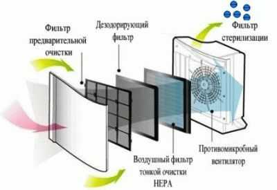 Рекламные ролики описывают общими словами. Наподобие: увлажняющий и дезодорирующий фильтры. Первый занят насыщением воздуха парами воды, второй очищает поток от запахов. Следующая ступень борется с бактериями. Такой очиститель воздуха включает в состав экстракт зеленого чая, гипоаллергенные и бактерицидные компоненты. Считается, что внутри остаются частицы крупнее 0,1 мкм и болезнетворные бактерии.