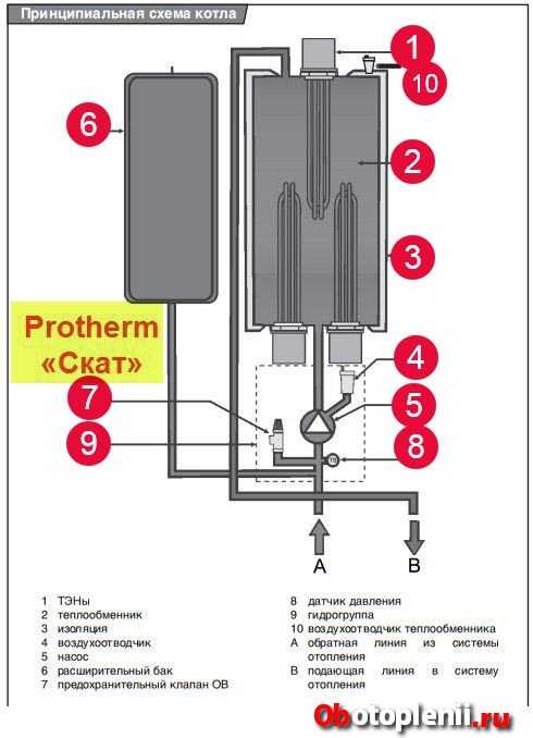 Посмотрим на конструкцию ТЭН котла на примере котла Proterm «Скат», мощности 6, 9, 12,14,18, 21, 24,28 КВт. Это модель настенного электрического котла с эквитермическим регулированием.