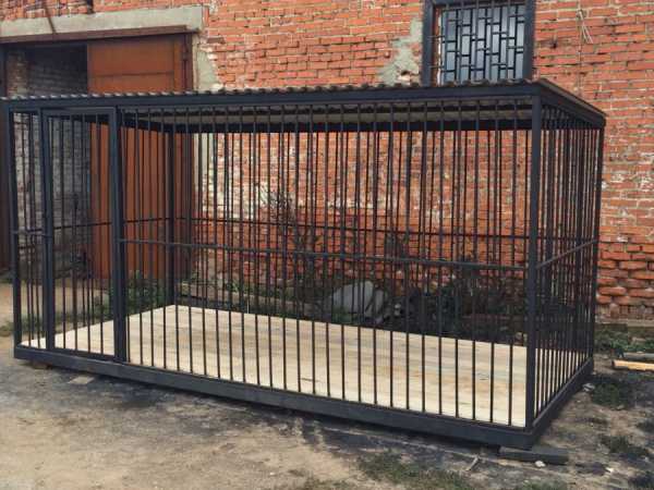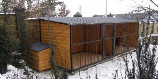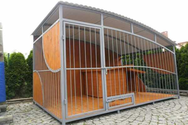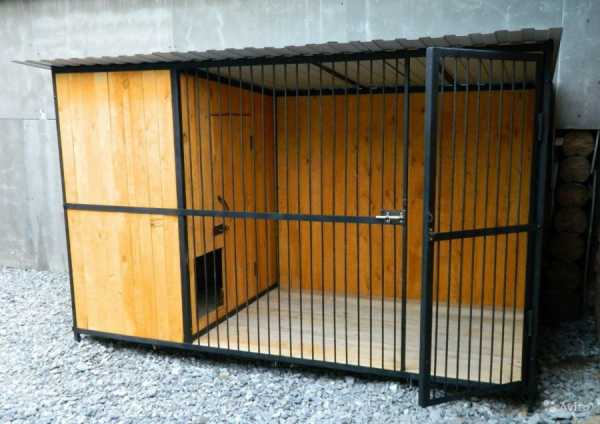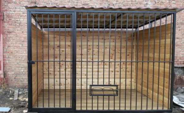 Если в вольере несколько глухих стен, то открытая стенка монтируется из металлических прутьев. Непременно должна присутствовать дверь и на территории еще потребуется расположить кормушку и будку.