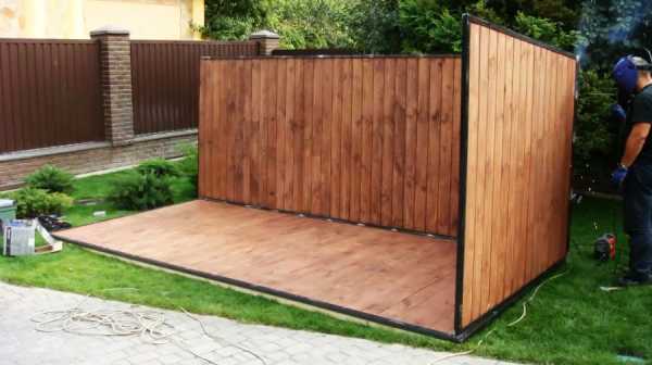 - Следующим этапом будет возведение ограждений. Необходимо сделать каркас из труб, но также следует учесть, что на передней стене будет располагаться дверь, поэтому здесь следует установить еще одну горизонтальную трубу. После этого стены нужно обшить деревом или обустроить решеткой.