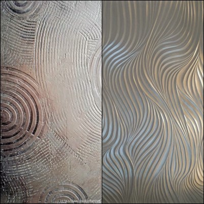 А можно отойти от напрашивающейся ассоциации с названием и вместо волны с помощью специальных валиков, штампов, либо различных подручных материалов создать уникальный рисунок. Такая отделка стен очень красива, но совершенно не подходит для благородных классических интерьеров где чаще применяют венецианскую, шелковую штукатурку и им подобные.