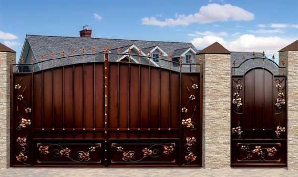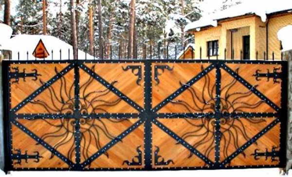 Для деревянных заборов можно тоже устанавливать ворота с кузнечной отделкой, но для создания сочетания с забором металлический рисунок ворот следует расположить на деревянном фоне.