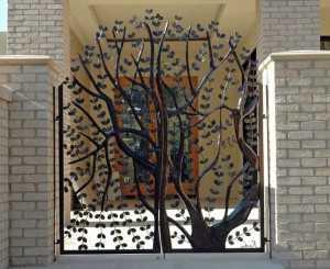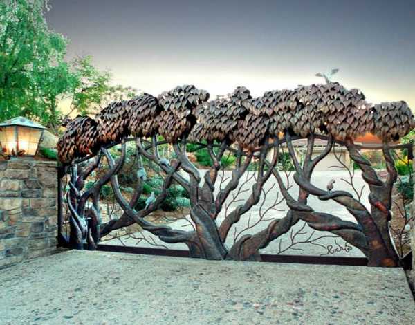 Металлические ворота с объемными изображениями деревьев.