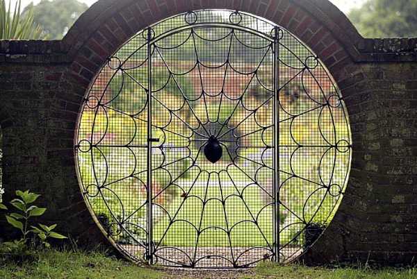 Оригинальный дизайн кованой калитки, выполненной в виде большой круглой паутины с пауком.