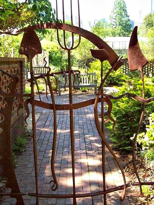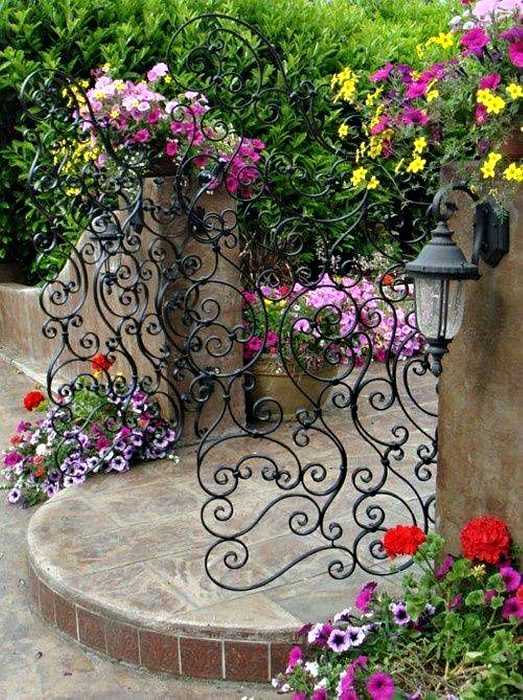 Восхитительная калитка с коваными фигурками в виде цветов под густой аркой живых растений.