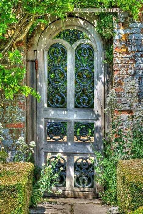 Роскошная старинная дверь прекрасно — прекрасная альтернатива калитке или воротам. Лучше всего такая дверь будет смотреться в сочетании с массивным кирпичным или каменным забором.