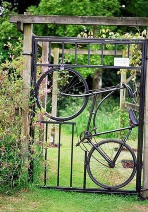 Обыкновенная металлическая калитка, украшенная настоящим велосипедом.
