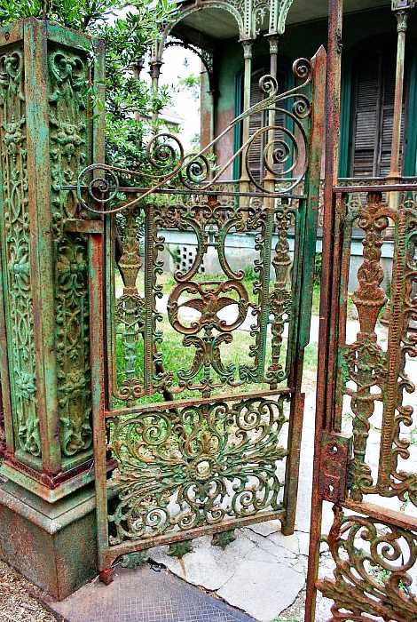 Великолепные ворота, украшенные фантастическими коваными фигурами дерева и павлинов.