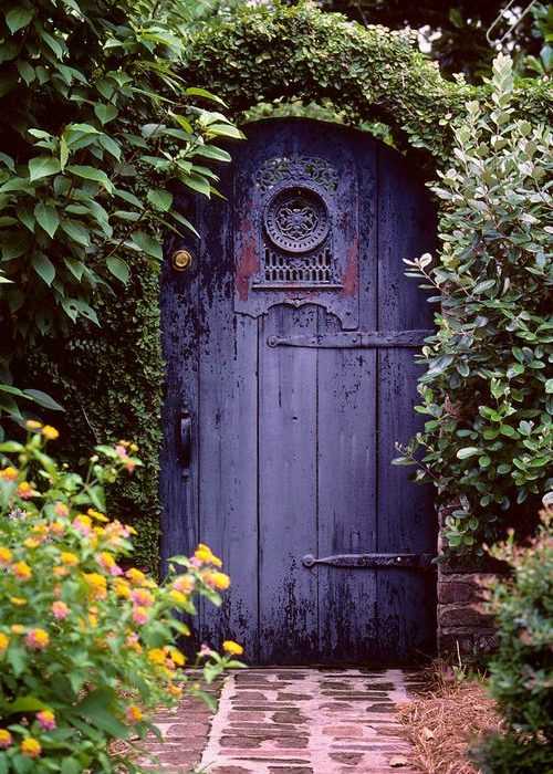 Массивная фиолетовая дверь в сад.