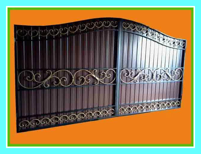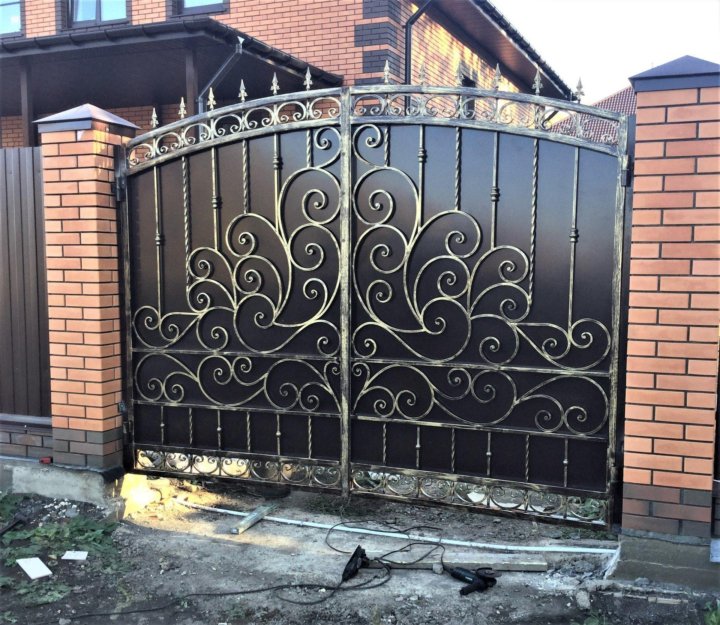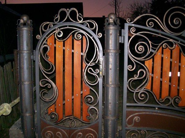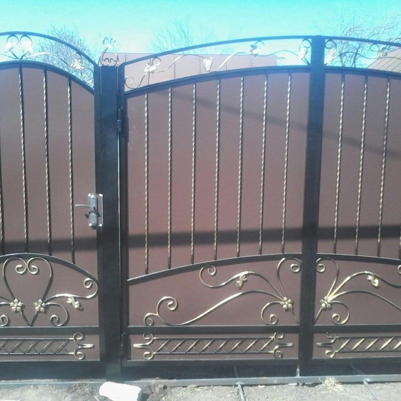 с калиткой, откатные и распашные, с профнастилом, с виноградной лозой и другими элементами, художественная горячая и холодная ковка