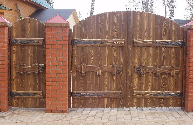 Ворота, ведущие во двор, — визитная карточка дома. Владельцы участка стараются сделать их привлекательными внешне, чтобы задать весь ансамбль усадьбы. Красивые деревянные ворота и калитки — распространённый вариант с высокими эстетическими характеристиками.