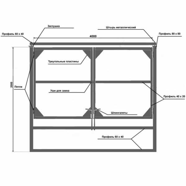 После, размеры с проекта переносятся на материал, из которого выполняются створки. Наиболее часто, это две одинаковые створки, которые являются зеркальным отражением друг друга. Створки выполняются в любой установленной форме, но наиболее практичными считаются горизонтально направленные прямоугольники. Для сборки рам отлично подходит профильная труба и сварка. Далее, возможна установка ребер жесткости из того же материала, которые выполняют задачу крепления поликарбоната, а также декоративного дополнения.