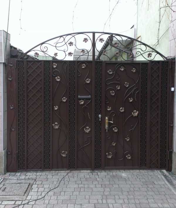 - Смешанные варианты. В пример можно привести конструкции, нижняя часть которых является глухой, а верхняя выполнена из полупрозрачного материала. Также часто устанавливаются кованые створки, на которых закреплен поликарбонат.