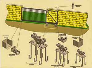 Технология установки проста, но требует определенной схемы, внимательности и много времени. Первым делом ворота поднимают, ролики ставят на подготовленный швеллер. При этом следует быть аккуратным, чтобы не сломать ролики. После установки рамы следует выставить уровень ворот (отрегулировать ролики по высоте). После этого следует установить поддерживающие ролики, которые будут перемещаться по балке на опорных столбах.
